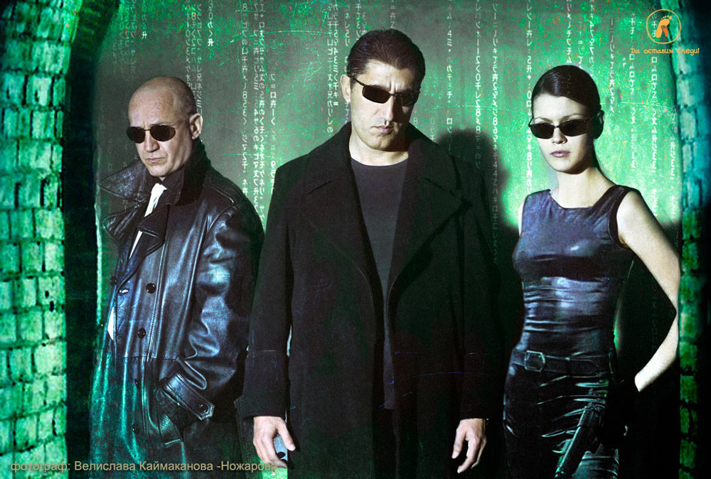 The image of Hristo Shopov (2013-December/2014 campaign volunteer), with Bashar Rahal and Ralitsa Paskaleva, is a picture clearly identified with the famous film Matrix.