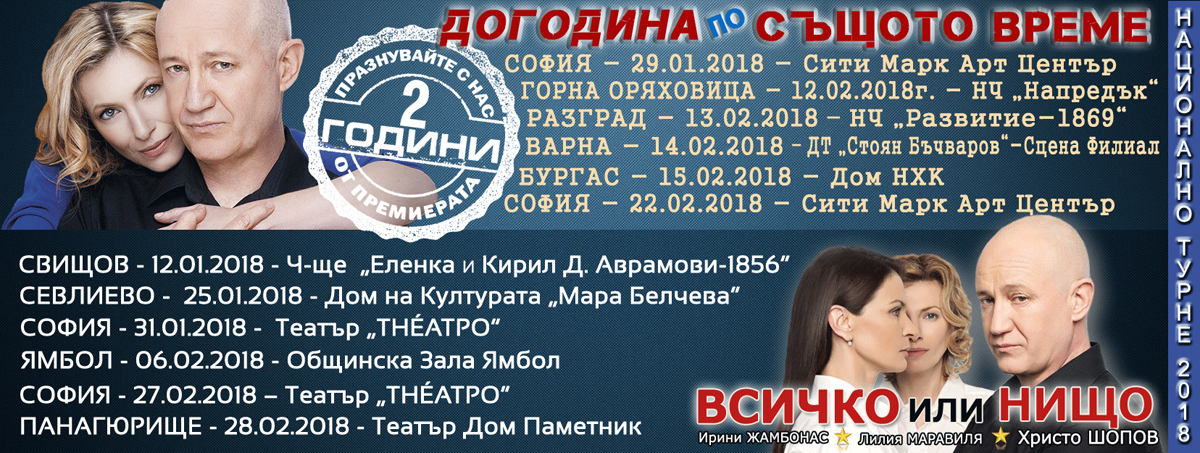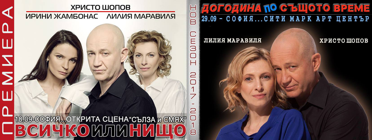The play "SAME TIME, ANOTHER YEAR" is one more co-project with the participation of Hristo Shopov and Lilia Maravilia. Their masterful performance conquered the theatre’s audience during the first part of the production - "Same time, next year" - a play based on the scenario of the brilliant playwright Bernard Slade.